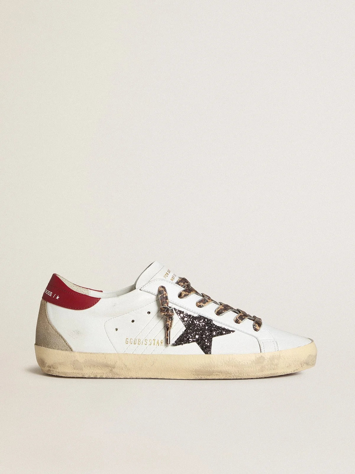 A timeless icon yet one that’s constantly evolving. At Golden, we love taking our classics and reworking them all the time, always from a new angle. These Super-Star with a white leather upper feature an anthracite glitter star, a red nappa heel tab, and an ice-gray suede insert on the back. And beige and brown leopard-print laces add the finishing touch. DETAILS Item No. GWF00102.F006517.82813 - White nappa leather upper - Anthracite glitter star - Red nappa leather heel tab - Insert on the back in ice-gray suede - Beige and brown leopard-print laces - Vintage finish - Upper: 85% sheepskin leather, 12% cow leather, 2% polyethylene terephthalate, 1% horn - Lining: 41% cotton, 31% cow leather, 17% textile polyurethane, 7% polyester, 4% viscose - Sole: 100% rubber - Handmade - Made in Italy