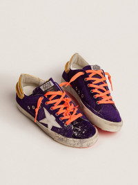 A timeless icon yet one that’s constantly evolving. At Golden, we love taking our classics and reworking them all the time, always from a new angle. These Limited Edition, numbered Super-Star LAB sneakers feature a purple velvet upper, a foam and PVC heel tab and a white leather star. A sprinkle of silver glitter on the toe cap of the right sneaker adds the finishing touch. DETAILS Item No. GWF00101.F002076.45346 - Color: purple - White leather star - Foam and PVC heel tab - Fluorescent pink laces - Vintage finish - Upper: 54% cotton, 39% polyester, 4% textile polyurethane - Lining: 60% cow leather, 40% cotton - Sole: 100% rubber - Handcrafted - Made in Italy