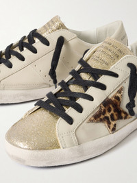 Golden Goose's 'Super-Star' sneakers are the brand's most popular - and recognizable - style. Made from off-white leather, this pair is hand-scuffed to give them an authentic lived-in look and feature a glittered gold tongue and signature star applique in leopard-print calf hair on each side. Size & Fit - Fits true to size, take your normal size - Only available in full sizes, go up to the nearest whole size if you take a half size - Italian sizing Details & Care - Rubber sole measures approximately 20mm/ 1 inch - Off-white matte leather, gold glittered leather (Cow), leopard-print calf hair - Lace-up front