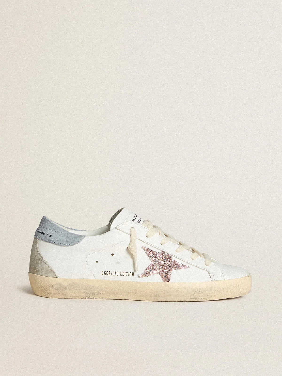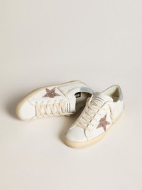 A timeless icon yet one that’s constantly evolving. At Golden, we love taking our classics and reworking them all the time, always from a new angle. These Super-Star with a white leather upper feature a multicolor glitter star and a light blue suede heel tab. The ice-gray suede insert on the back and white laces add the finishing touch. DETAILS Item No. GWF00102.F006569.12122 - Color: white - Multicolor glitter star - Light blue suede heel tab - Insert on the back in ice-gray suede - White laces - Vintage finish - Upper: 41% cotton, 31% cow leather, 18% textile polyurethane, 7% polyester, 3% viscose - Lining: 97% cow leather, 2% polyethylene terephthalate, 1% cotton - Sole: 100% rubber - Handmade - Made in Italy