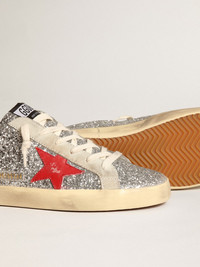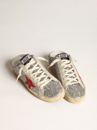 Our iconic sneakers in the new sabot version: this Super-Star model features a classic upper in silver glitter accentuated with a red leather star and ice-gray suede inserts including the heel tab. The cream-colored laces complete the look. DETAILS Item No. GWF00110.F003780.81521 - Silver glitter upper - Red leather star - Ice-gray suede heel tab - Ice-gray suede inserts - Cream-colored laces - Vintage finish - Upper: 50% polyethylene terephthalate, 28% cow leather, 22% cotton - Lining: 88% cow leather, 12% cotton - Sole: 100% rubber