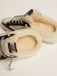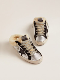 Our iconic sneakers in the new sabot version: lined with soft shearling, these Super-Star sneakers feature a silver laminated leather upper embellished with a black suede star and inserts. The beige shearling tongue and ice-gray laces complete the look. DETAILS Item No. GWF00110.F002307.70149 - Silver laminated leather upper - Shearling lining - Black suede star and inserts - Beige shearling tongue - Ice-gray laces - Vintage finish - Upper: 68% sheepskin leather, 32% cow leather - Lining: 75% sheepskin leather, 25% cow leather - Sole: 100% rubber