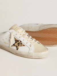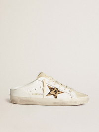 The sabot version of our iconic sneakers: with an upper in white leather, these Super-Star feature the classic pony skin star in beige and brown leopard print. The beige suede tongue and gold Lurex laces complete the look. DETAILS Item No. GWF00110.F006566.82823 - Color: white - Pony skin star in beige and brown leopard-print - Beige suede tongue - Gold lurex laces - Vintage finish - Upper: 100% cow leather - Lining: 37% textile polyurethane, 30% cow leather, 21% cotton, 12% viscose - Sole: 100% rubber - Handmade - Made in Italy