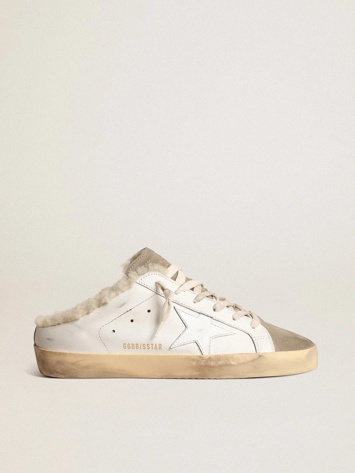 A timeless icon yet one that’s constantly evolving. At Golden, we love taking our classics and reworking them all the time, always from a new angle. Lined in soft beige shearling, this sabot version of our Super-Star sneakers in white leather features a glossy white leather star and a dove-gray suede tongue. And cream-colored laces add the finishing touch. DETAILS Item No. GWF00110.F003975.81760 - Color: white - Glossy white leather star - Dove-gray suede tongue - Beige shearling lining - Cream laces - Vintage finish - Upper: 100% cow leather - Lining: 70% sheepskin leather, 30% cow leather - Sole: 100% rubber - Handmade - Made in Italy