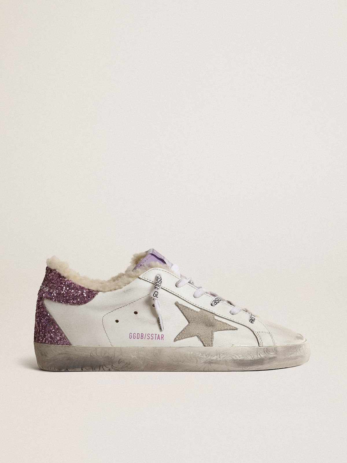 A timeless icon yet one that’s constantly evolving. At Golden, we love taking our classics and reworking them all the time, always from a new angle. These white leather Super-Star sneakers feature a glitter heel tab, a gray suede star and a nubuck tongue. Foxing made up of raised flowers adds the finishing touch. DETAILS Item No. GWF00102.F001623.10641 - White leather upper - Gray suede star - Lavender-color glitter heel tab - Lavender-color nubuck tongue - White laces with lettering - Shearling lining - Lived-in finish - Upper: 88% cow leather, 8% polyethylene, 4% cotton - Lining: 65% sheepskin leather, 30% cow leather, 5% cotton - Sole: 100% rubber - Handmade - Made in Italy