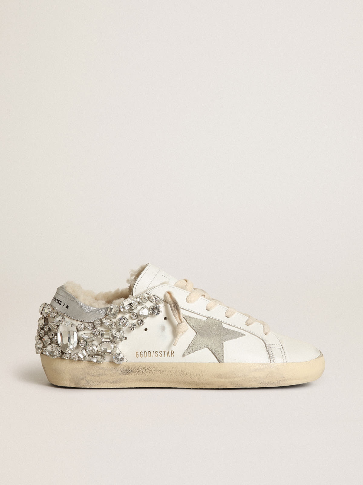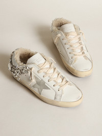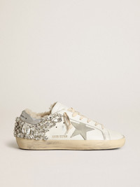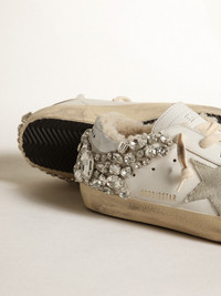 A timeless icon yet one that’s constantly evolving. At Golden, we love taking our classics and reworking them all the time, always from a new angle. With a white leather upper embellished with decorative crystals on the back, these Super-Star sneakers feature an ice-gray suede star and silver metallic leather heel tab. The shearling lining and cream-colored laces add the finishing touch. DETAILS Item No. GWF00174.F003355.10273 - Color: white - Shearling lining - Ice-gray suede star - Silver metallic leather heel tab - Decorative crystals on the back - Cream-colored laces - Vintage finish - Upper: 100% cow leather - Lining: 70% sheepskin leather, 30% cow leather - Sole: 100% rubber - Handmade - Made in Italy