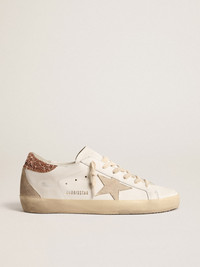 A timeless icon yet one that’s constantly evolving. At Golden, we love taking our classics and reworking them all the time, always from a new angle. These Super-Star with a white leather upper feature a beige suede star and a peach-pink glitter heel tab. The peach-pink suede insert on the back and cream-colored laces add the finishing touch. DETAILS Item No. GWF00102.F004489.11471 - Color: white - Beige suede star - Peach-pink glitter heel tab - Peach-pink suede insert on the back - Cream-colored laces - Vintage finish - Upper: 96% cow leather, 3% polyethylene terephthalate, 1% cotton - Lining: 49% cow leather, 41% cotton, 7% polyester, 3% textile polyurethane - Sole: 100% rubber - Handmade - Made in Italy