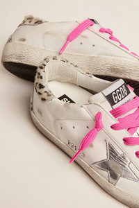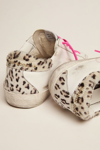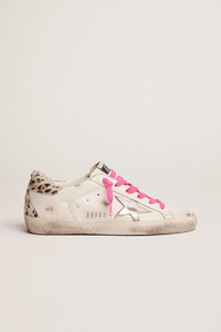 A timeless icon yet one that’s constantly evolving. At Golden, we love taking our classics and reworking them all the time, always from a new angle. These Super-Star sneakers with a white leather upper feature a silver metallic leather star and leopard-print pony skin details in white, cream and black, such as the heel tab and the insert on the back. And pink laces add the finishing touch. DETAILS Item No. GWF00102.F002472.10881 - Color: white - Silver metallic leather star - Leopard-print pony skin heel tab in white, cream and black - Leopard-print pony skin insert on the back in white, cream and black - Galvanic silver metal GGDB lettering - Pink laces - Vintage finish - Upper: 100% cow leather - Lining: 60% cow leather, 40% cotton - Sole: 100% rubber - Handmade - Made in Italy