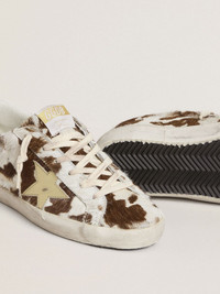 A timeless icon yet one that’s constantly evolving. At Golden, we love taking our classics and reworking them all the time, always from a new angle. These women’s Super-Star with a pony skin upper in brown and white animal-print feature a gold metallic leather star and a white leather heel tab. And white laces add the finishing touch. DETAILS Item No. GWF00101.F007262.82940 - Brown and white animal-print pony skin upper - Gold metallic leather star - White leather heel tab - White laces - Vintage finish - Upper: 100% cow leather - Lining: 34% cotton, 35% cow leather, 19% textile polyurethane, 7% polyester, 5% viscose - Sole: 100% rubber - Handmade - Made in Italy