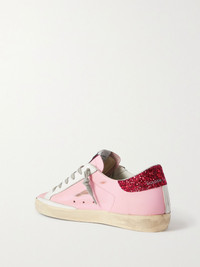 EXCLUSIVE AT NET-A-PORTER. Golden Goose's 'Superstar' sneakers are carefully distressed by hand, so each pair has a one-of-a-kind finish. Set on bouncy rubber soles, they're detailed with glittered heel tabs and star motifs. The pink and red colorway will look best with both neutral hues. Size & Fit - Fits true to size, take your normal size - Only available in full sizes, go up to the nearest whole size if you take a half size - Italian sizing Details & Care - Heel measures approximately 30mm/ 1 inch - Pink and white leather, red glittered leather (Cow) - Lace-up front - Made in Italy