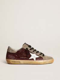 A timeless icon yet one that’s constantly evolving. At Golden, we love taking our classics and reworking them all the time, always from a new angle. These women's Super-Star with a burgundy glitter upper feature a white leather star and a dove-gray suede heel tab. The taupe suede tongue and inserts, paired with black laces, complete the look. DETAILS Item No. GWF00101.F003185.81770 - Burgundy glitter upper - White leather star - Dove-gray suede heel tab - Dove-gray suede tongue - Dove-gray suede inserts - Black laces - Vintage finish - Upper: 49% cow leather, 36% PET, 15% cotton - Lining: 60% cow leather, 40% cotton - Sole: 100% rubber - Handmade - Made in Italy