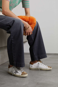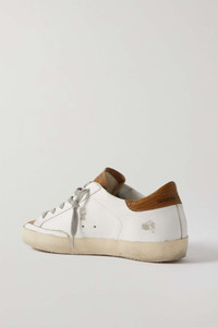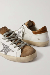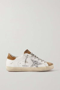 No two pairs of Golden Goose sneakers are the same - the brand's shoes often feature unusual, distinctive details and are finished with signature hand-distressing. This classic 'Superstar' style is made from leather and decorated with snake-effect heel tabs and suede trims. The iconic glittered star is instantly recognizable. Size & Fit - Fits large to size, take a full size smaller than normal - Only available in full sizes, go down to the nearest whole size if you take a half size - Italian sizing Details & Care - Rubber sole measures approximately 10mm/ 0.5 inches - White smooth leather, tan snake-effect leather, light-brown suede - Lace-up front - Designer color: White/ Tobacco/ Silver/ Taupe