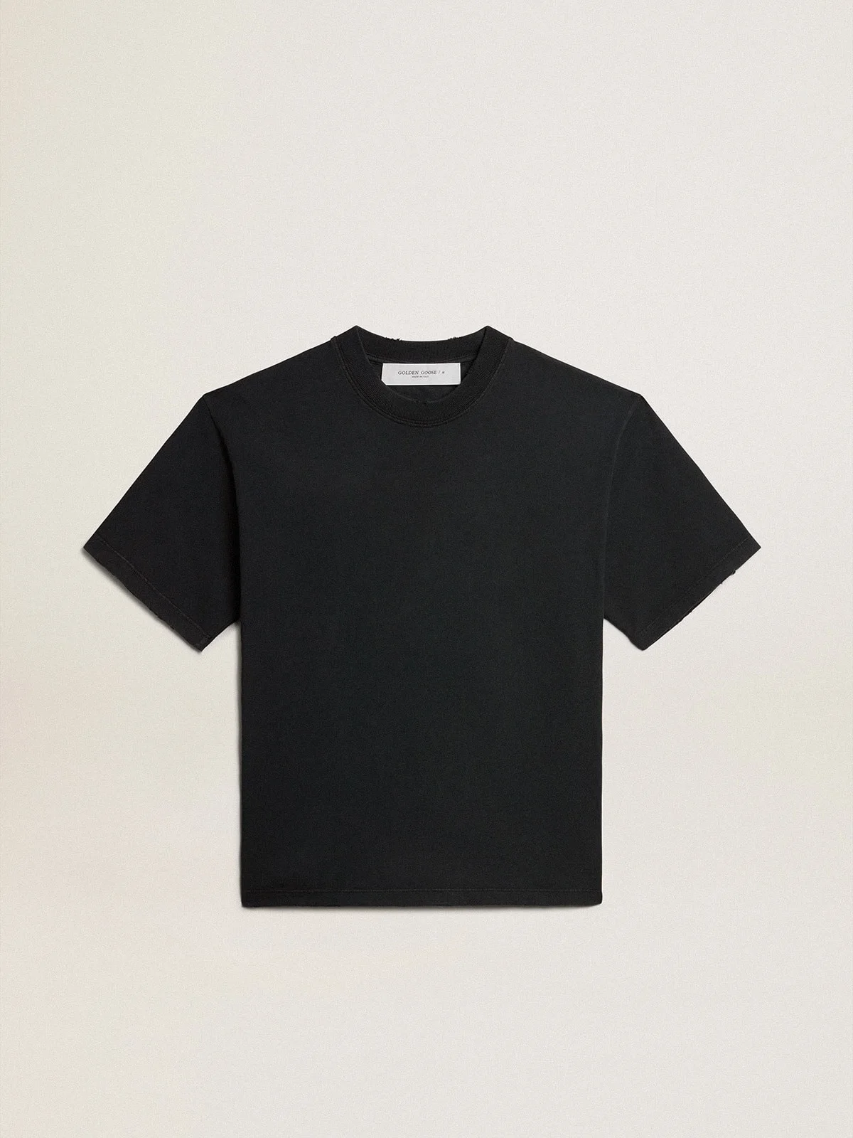 A unique, timeless collection that encapsulates the Golden Goose DNA, designed to remain with you every day, through thick and thin, come rain or shine. In washed black cotton with a distressed finish, this T-shirt with an Asian Market Exclusive fit features a raised reverse Golden logo on the back. DETAILS Item No. GWP01874.P001576.90456 - Color: washed black - Reverse Golden logo on the back - Double gold star on the back - Boxy fit - Asian Market Exclusive - Short sleeves - Distressed finish - Main material: 100% cotton - Made in Italy The model is 183 cm tall and is wearing a size M.
