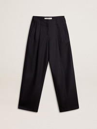 The third drop in our Fall/Winter 25 collection channels the funky glamor of the 1970s, a time when the night transformed into a canvas for unapologetic self-expression. These women’s tailored pants in dark blue wool feature vertical stripes and a double star on the back. DETAILS Item No. GWP01203.P002098.50629 - Journey Collection - Color: dark blue - Relaxed fit - Vertical stripes - Double star on the back - Main material: 99% virgin wool, 1% cotton - Pocket lining material: 100% cotton - Made in Italy The model is 177 cm tall and is wearing a size 40.