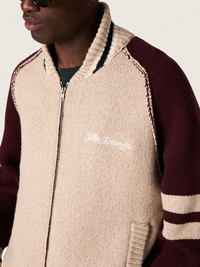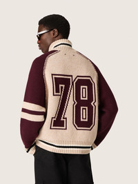 Our Holiday Collection is a celebration of woven textures and sharp tailoring, blending with soft knits, velvet whispers, archive florals, and satin that catches the light just right. A statement piece in a retro style: this unisex bomber jacket with a regular fit is made of wool-blend yarn in shades of white and burgundy. The jacquard design features the number '78' in burgundy on the back, two-tone stitching on the front and back, and a front zip closure. The ribbed edges with contrasting black and white stripes and the iconic double star on the back complete the look. DETAILS Item No. GUP02583.P002401.15880 - Journey Collection - Color: white and burgundy - Unisex bomber jacket - Regular fit - Raglan sleeves - Ribbed edges with contrasting black and white stripes - Jacquard knit with number '78' on the back - Two-tone chain stitching - Zip fastening - Double star on the back - Main material: 75% virgin wool, 10% cotton, 10% polyamide, 5% cashmere - Made in Italy The model is 183 cm tall and is wearing a size M.