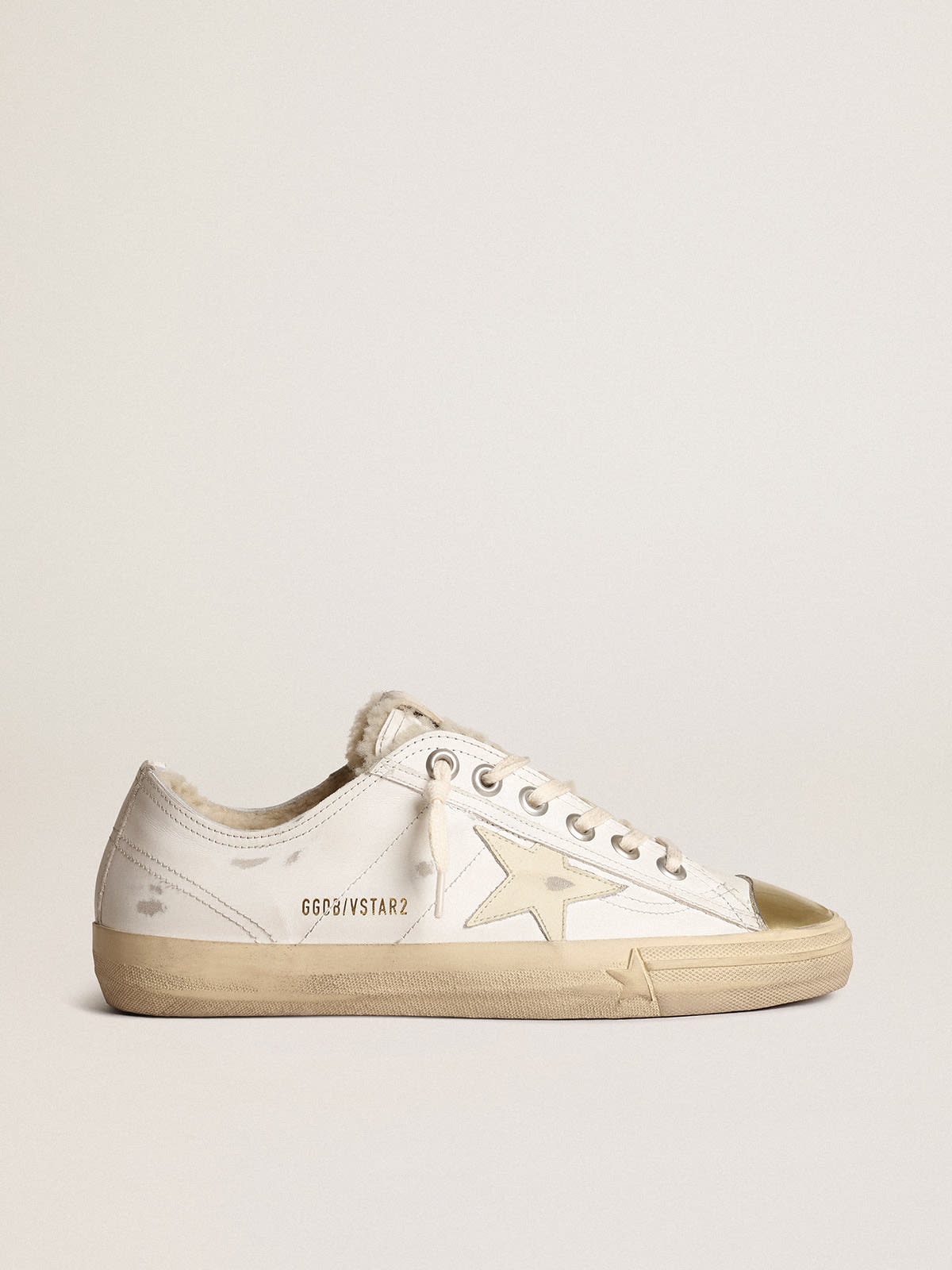 Beauty that lies in simplicity: in our V-Star sneakers, an essential shape meets stylish detail. Lined with soft beige shearling, this model in white leather features a cream leather star. The toe in metallic gold-colored leather and cream-colored laces add the finishing touch. DETAILS Item No. GWF00457.F003990.10318 - Color: white - Cream leather star - Beige shearling lining - Gold metallic leather toe - Cream laces - Vintage finish - Upper: 100% cow leather - Lining: 61% sheepskin leather, 39% cow leather - Sole: 100% rubber - Handmade - Made in Italy