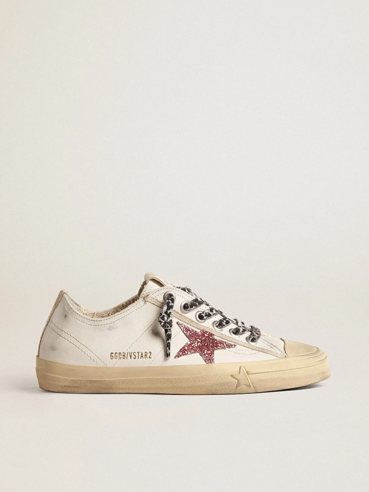 Beauty that lies in simplicity: in our V-Star sneakers, an essential shape meets stylish detail. This model with a white leather upper features a pink glitter star and a platinum metallic leather heel tab. The leopard-print laces in hues of white and black add the finishing touch. DETAILS Item No. GWF00129.F004576.11504 - Color: white - Pink glitter star - Platinum metallic leather heel tab - Beige rubber toe - Black and white leopard-print laces - Vintage finish - Upper: 89% cow leather, 7% acrylic, 2% polyethylene, 1% polyester, 1% cotton - Lining: 54% cotton, 39% cow leather, 5% polyester, 2% polyurethane - Sole: 100% rubber - Handmade - Made in Italy