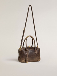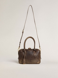 Our Vita Bag is a tribute the triumphant epoch of La Dolce Vita and its aesthetic codes, speaking to the wanderlust of the refined traveler. This brown vintage leather model features a double fastening: a double-pull zip and a golden key. The gold logo printed on the front and the snap hook enclosed in a leather case on the outside add the finishing touch. DETAILS Item No. 8050235975088 - Lock closure with gold-tone buckle with side buttons - Double-pull zip fastening - Inner card holder - Inside pocket with gold-tone zip closure - Two inner document pockets - Double side hook - Gold logo on the front - Leather shoulder strap - Leather-covered snap hook - Main material: 100% cow leather - Lining: 100% cotton - Size: 25 x 17.5 x 10 cm - Chain length: 110 cm to fourth hole - Handmade - Made in Italy