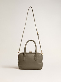 Our Vita Bag is a tribute the triumphant epoch of La Dolce Vita and its aesthetic codes, speaking to the wanderlust of the refined traveler. In sage-green sheepskin leather, this model features a double closure: a double-pull zip and a golden key. The gold logo printed on the front and the snap hook enclosed in a leather case on the outside add the finishing touch. DETAILS Item No. 8050235736757 - Color: sage green - Lock closure with gold-tone buckle with side buttons - Double-pull zip fastening - Inside pocket with gold-tone zip closure - Inner card holder - Two inner document pockets - Double side hook - Gold logo on the front - Leather shoulder strap - Leather-covered snap hook - Main material: 100% sheepskin leather - Lining: 100% sheepskin leather - Size: 25 x 31 x 11 cm - Chain length: 110 cm to fourth hole