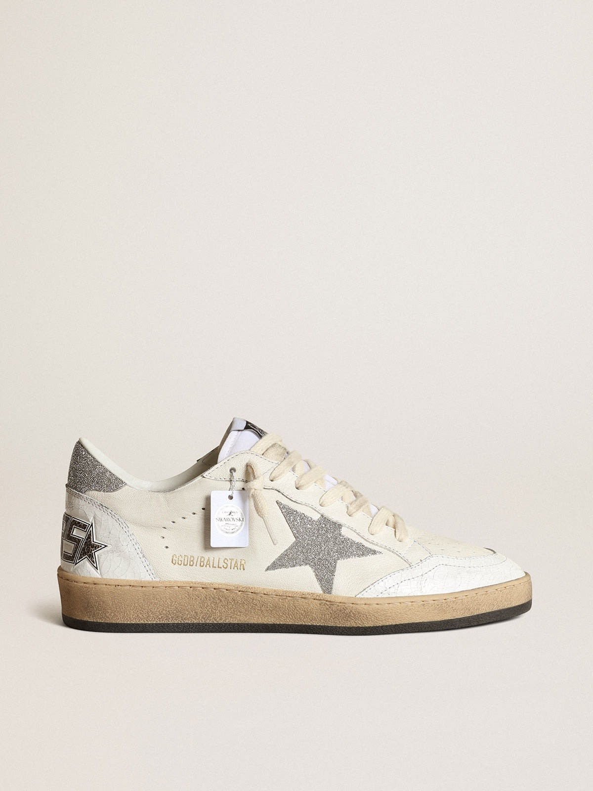 Dreaming of the Eighties. Our Ball Star sneakers have an American college vibe caught between a hoop shot and a skateboard ride. These sneakers with a white nappa leather upper feature a star and heel tab in silver-colored Swarovski micro-crystals. The white crackle leather inserts and white laces add the finishing touch: beautiful things that never go out of fashion. DETAILS Item No. GWF00117.F003430.80185 - White nappa leather upper - Star in silver-colored Swarovski micro-crystals - Heel tab in silver-colored Swarovski micro-crystals - White crackled leather inserts - White laces - Vintage finish - Upper: 63% sheepskin leather, 18% cow leather, 6% polyester, 5% crystals, 3% polyamide, 3% textile polyurethane, 1% spandex, 1% nylon - Lining: 64% cow leather, 36% cotton - Sole: 100% rubber - Handmade - Made in Italy