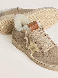 Dreaming of the Eighties. Our Ball Star sneakers have an American college vibe caught between a hoop shot and a skateboard ride. This women's model with a beige wool upper features a soft white shearling lining, a gold-colored metallic leather star and a beige suede heel tab. And the beige laces add the finishing touch: beautiful things that never go out of fashion. DETAILS Item No. GWF00117.F007872.15100 - Beige wool upper - Gold metallic leather star - Beige suede heel tab - Beige suede insert on the back - Beige suede toe - White shearling lining - White shearling tongue - Beige laces - Vintage finish - Upper: 40% virgin wool, 36% cow leather, 14% sheepskin leather, 10% polyamide - Lining: 50% sheepskin leather, 20% cow leather, 20% polyester, 10% cotton - Sole: 100% rubber - Handmade - Made in Italy