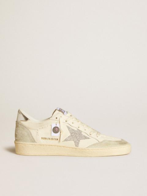 Dreaming of the Eighties. Our Ball Star sneakers have an American college vibe caught between a hoop shot and a skateboard ride. With an upper in white leather with a lived-in effect accentuated by an ice-gray suede toe, this model features a tone-on-tone white leather star and heel tab. The white crackle leather insert on the back, red lettering, and worn-white laces add the finishing touch: beautiful things that never go out of fashion. DETAILS Item No. GWF00117.F006987.10273 - Color: worn white - Tone-on-tone white leather star - Tone-on-tone white leather heel tab - Worn white laces - Vintage finish - Red ‘Sneakers’ lettering on the back - Upper: 78% sheepskin leather, 14% rubber, 8% cow leather - Lining: 31% cow leather, 27% cotton, 24% polyurethane, 12% polyester, 6% viscose - Sole: 100% rubber - Handmade - Made in Italy