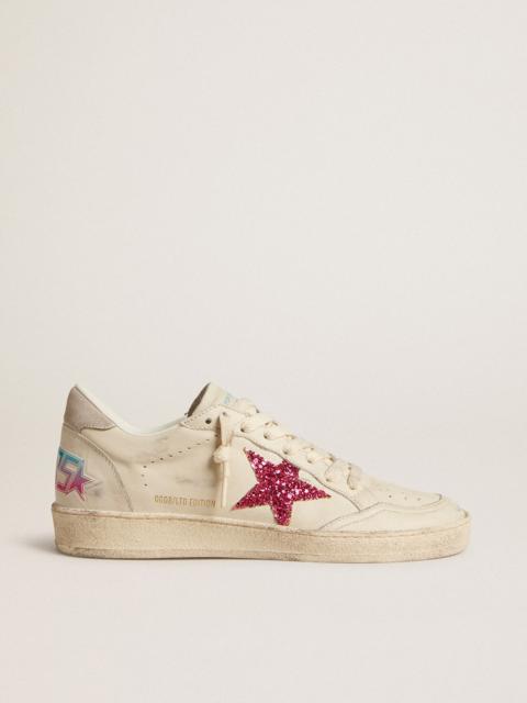 Dreaming of the Eighties. Our Ball Star sneakers have an American college vibe caught between a hoop shot and a skateboard ride. This model with a white nappa leather upper features a red leather star, a pink glitter heel and a white suede tongue with a worn effect. The pink glitter insert on the back, the toe in white crackle leather and the cream-colored laces add the finishing touch: beautiful things that never go out of fashion. DETAILS Item No. GWF00117.F006688.80930 - White nappa leather upper - Red leather star - Pink glitter heel tab - Worn-effect white suede tongue - Pink glitter insert on the back - White crackle leather toe - Cream-colored laces - Vintage finish - Upper: 59% sheepskin leather, 26% cow leather, 10% polyethylene terephthalate, 5% cotton - Lining: 34% cotton, 31% cow leather, 23% textile polyurethane, 8% viscose, 4% polyester - Sole: 100% rubber - Handmade - Made in Italy
