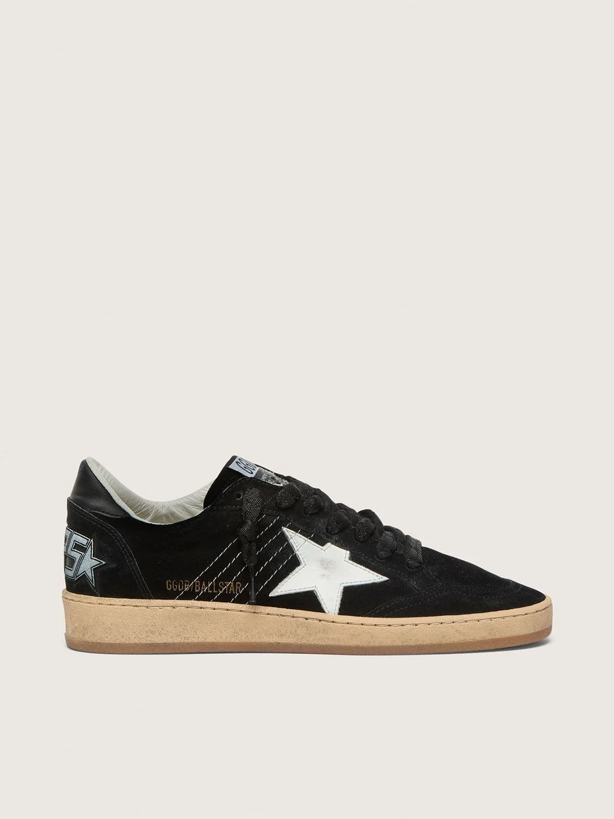 Dreaming of the Eighties. Our Ball Star sneakers have an American college vibe caught between a hoop shot and a skateboard ride. This women’s model with a black suede upper accentuated by contrasting white stitching features a white leather star and a black leather heel tab. And the light cream laces add the finishing touch: beautiful things that never go out of fashion. DETAILS Item No. GWF00117.F003246.80203 - Black suede upper - White leather star - Black leather heel tab - Black suede insert on the back - Contrasting white stitching - Light cream laces - Vintage finish - Upper: 100% cow leather - Lining: 66% cow leather, 34% cotton - Sole: 100% rubber