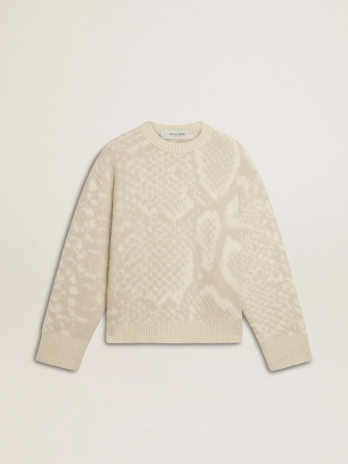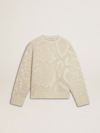 Created to celebrate Chinese New Year and the Year of the Snake, this piece represents transformation and rebirth, combining elegance and symbolism in every detail. This beige sweater for women has a relaxed and simple design, making it perfect for both casual and elegant looks. In virgin wool, it features a tone-on-tone snakeskin pattern. Ribbed fabric trim on the sleeve edges and hem and double gold star on the back add the finishing touch. DETAILS Item No. GWP02276.P001820.11684 - Color: beige - Double star on the back - Round neck - Tone-on-tone snakeskin pattern - Relaxed fit - Main material: 60% virgin wool, 25% mohair, 15% nylon - Made in Italy The model is 177 cm tall and is wearing a size S.