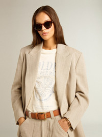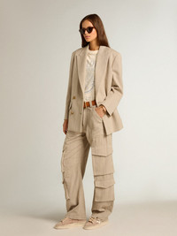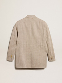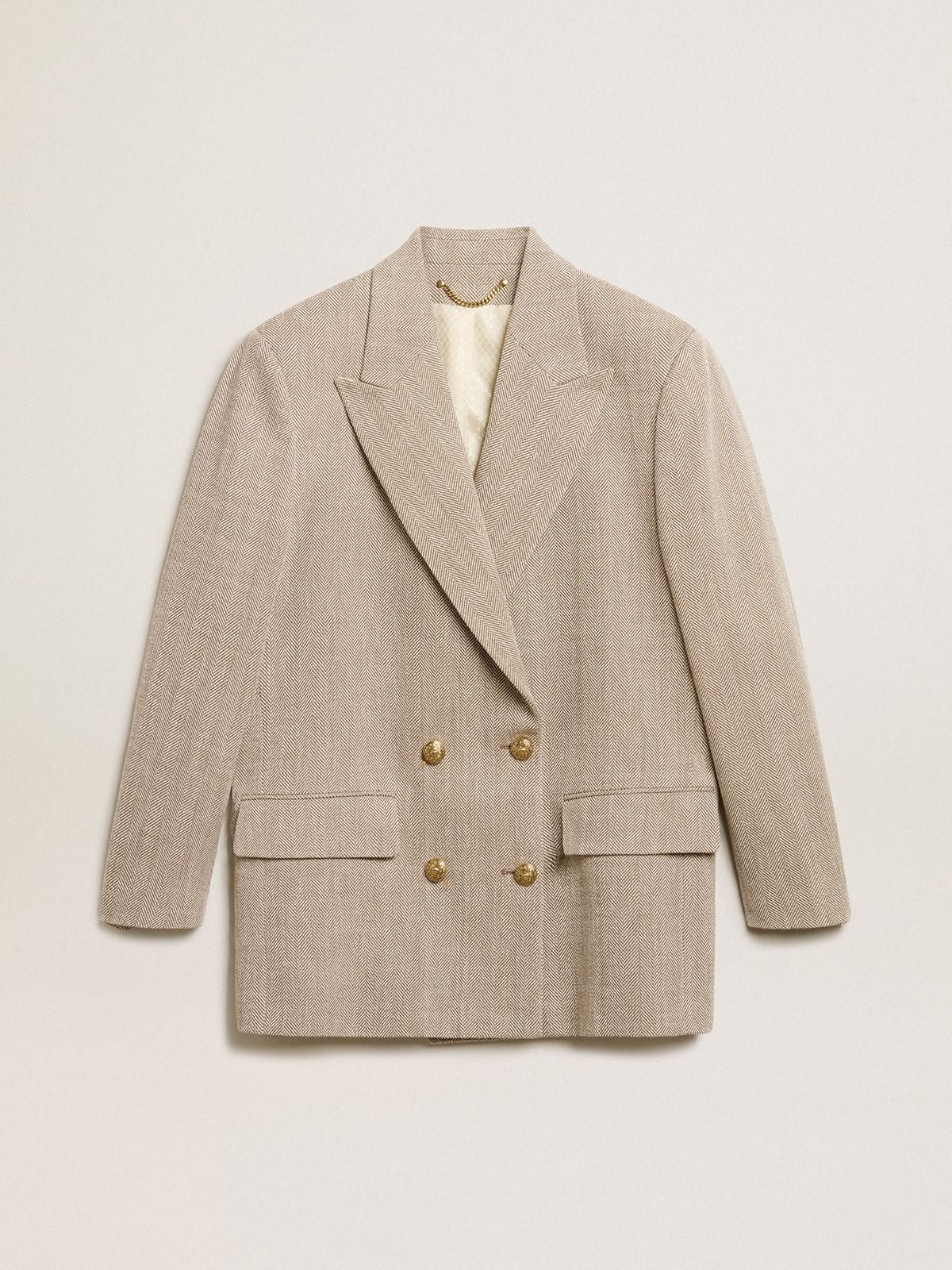 From Venice, our home, to Paris, our dream. This Journey Collection captures the essence and beauty of everyday moments in the City of Lights, immersed in a mesmerizing atmosphere where intimacy, authenticity and curiosity are the pulsating soul of it. A herringbone cotton fabric from the vintage archives has been chosen for this women's beige double-breasted blazer with a boyfriend fit. The garment features a fastening with golden heraldic buttons and a slit in the center at the back. DETAILS Item No. GWP01676.P001342.35876 - Journey Collection - Color: beige - Two pockets on the front - Double star on the back - Boyfriend fit - Button fastening - Main material: 100% cotton - Lining: 54% acetate, 46% viscose - Made in Italy The model is 177 cm tall and is wearing a size 40.