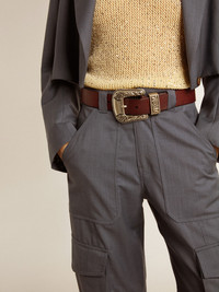 When simplicity is enriched with unique details. This model made of washed burgundy leather features a silver-colored decorated buckle. DETAILS Item No. GWA00179.A000133.40293 - Color: burgundy - Fastening with silver-colored decorated buckle - Fit: high-waisted - Main material: 100% cow leather - Made in Italy