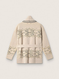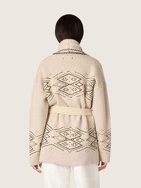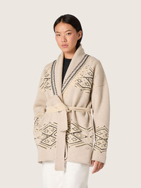 Our Holiday Collection is a celebration of woven textures and sharp tailoring, blending with soft knits, velvet whispers, archive florals, and satin that catches the light just right. Made from a beige wool and viscose blend with jacquard knit, this women's cardigan features multicolor bead embroidery and a loose thread effect on the reverse side. The matching knit belt, shawl collar and double star on the back complete the look. DETAILS Item No. GWP01409.P002389.15402 - Journey Collection - Color: beige - Women's cardigan - Regular fit - Hand embroidery with multicolored beads - Loose thread effect on the reverse - Jacquard knit - Shawl collar - Matching knit belt - Double star on the back - Main material: 60% virgin wool, 40% viscose - Made in Italy The model is 177 cm tall and is wearing a size S.