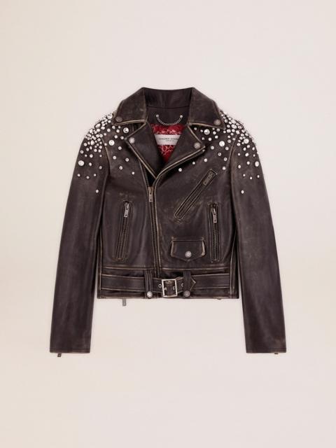 A unique, timeless collection that encompasses the essence of Golden Goose, designed to remain with you every day and accompany your highs and lows, come rain or shine. Made of our traditional bull leather, this slim-fit biker jacket features a distressed treatment and cabochon crystals on the upper section. The burgundy paisley-print lining adds the finishing touch. DETAILS Item No. GWP00848.P000648.90100 - Color: black - Cabochon crystals - Burgundy paisley-print lining - Double gold star on the back - Slim fit - Four front pockets - Belt with buckle - Long sleeves - Zip fastening - Distressed treatment - Main material: 100% cow leather - Lining: 100% polyester - Sleeve lining: 100% polyester - Made in Italy The model is 177 cm tall and is wearing a size S.