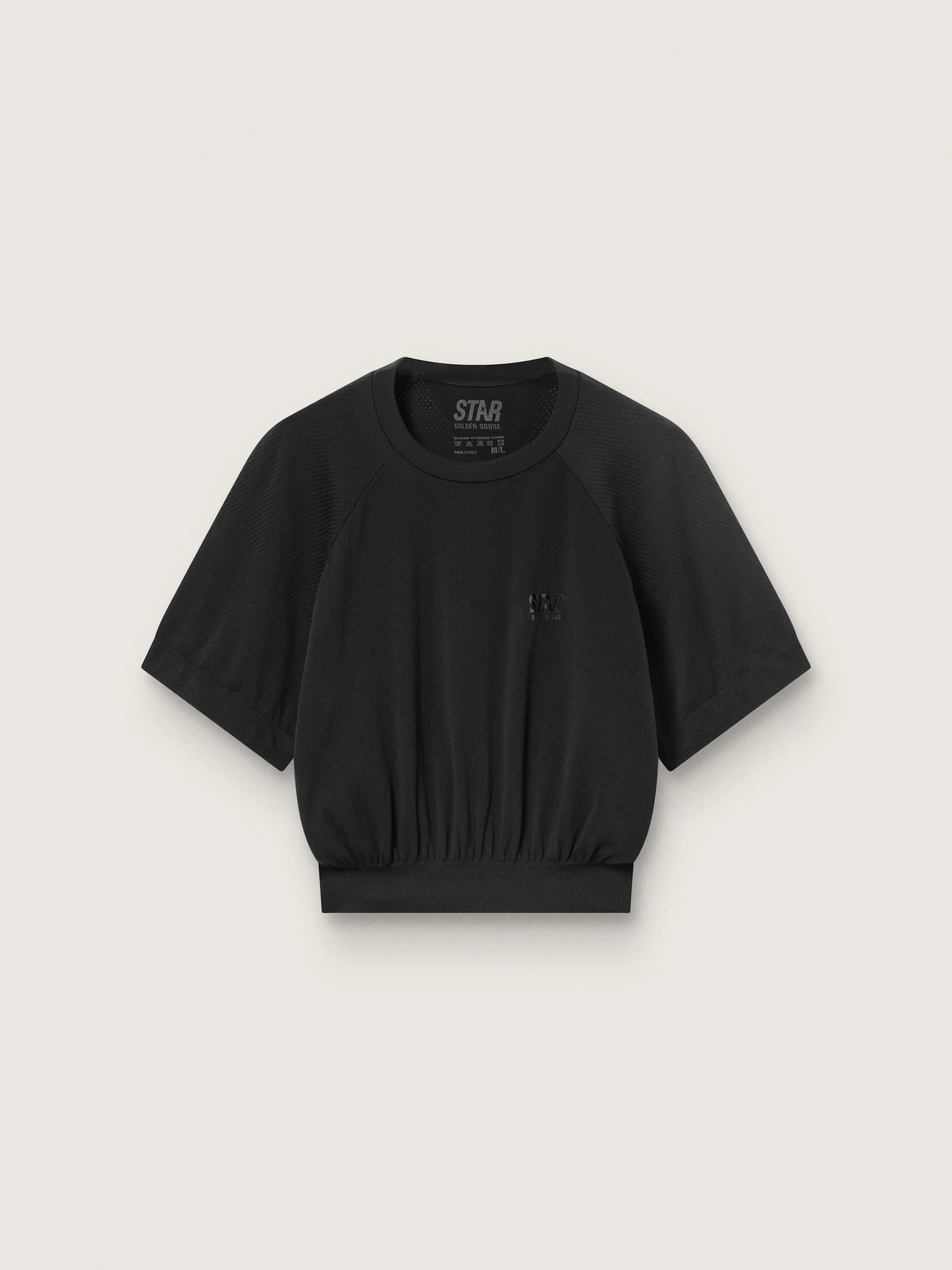 A collection with a casual soul but a versatile attitude: inspired by the Seventies, it has a timeless vintage appeal, suited to any occasion or look. With a cropped fit, this women's black sports T-shirt features breathable mesh inserts on the sleeves and back and embroidered tone-on-tone stars on the edges of the sleeves. The black Star logo on the front and the Golden star on the back add the finishing touch. DETAILS Item No. GWP02108.P001840.90100 - Star Collection - Color: black - Cropped fit - Mesh inserts - Sleeve edges with tone-on-tone embroidered stars - Black Star logo - Main material: 56% polyamide, 41% polypropylene, 3% spandex - Made in Italy