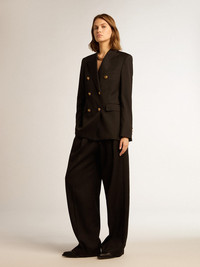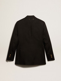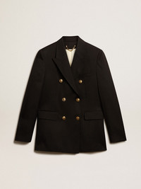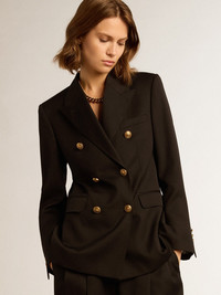 A unique, timeless collection that encapsulates the Golden Goose DNA, designed to remain with you every day, through thick and thin, come rain or shine. This women’s regular-fit double-breasted blazer in black wool gabardine features a fastening with gold heraldic buttons. DETAILS Item No. GWP00829.P001521.90100 - Golden Collection - Color: black - Double-breasted style - Double gold star on the back - Three front pockets - Long sleeves - Fastening with gold heraldic buttons - Main material: 100% virgin wool - Lining: 100% viscose - Sleeve lining: 55% polyester, 45% viscose - Made in Italy The model is 177 cm tall and is wearing a size 40.