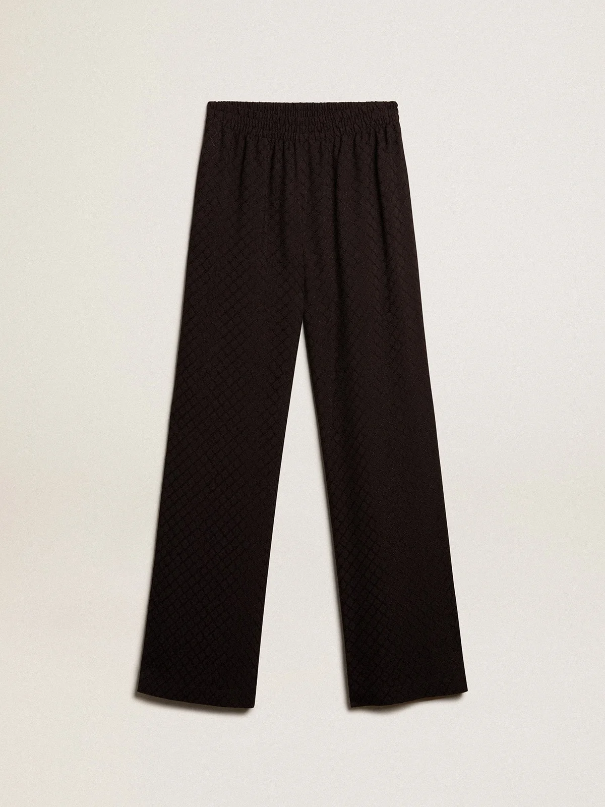 From Venice, our home, to Paris, our dream. This Journey Collection captures the essence and beauty of everyday moments in the City of Lights, immersed in a mesmerizing atmosphere where intimacy, authenticity and curiosity are the pulsating soul of it. These stylish women’s joggers in black viscose feature a loose-fit leg and an all-over check pattern. DETAILS Item No. GWP00821.P001361.90100 - Journey Collection - Color: black - Double gold star on the back - Loose fit - Two pockets - Main material: 100% viscose - Lining: 100% polyester - Made in Italy The model is 177 cm tall and is wearing a size 40 (IT).