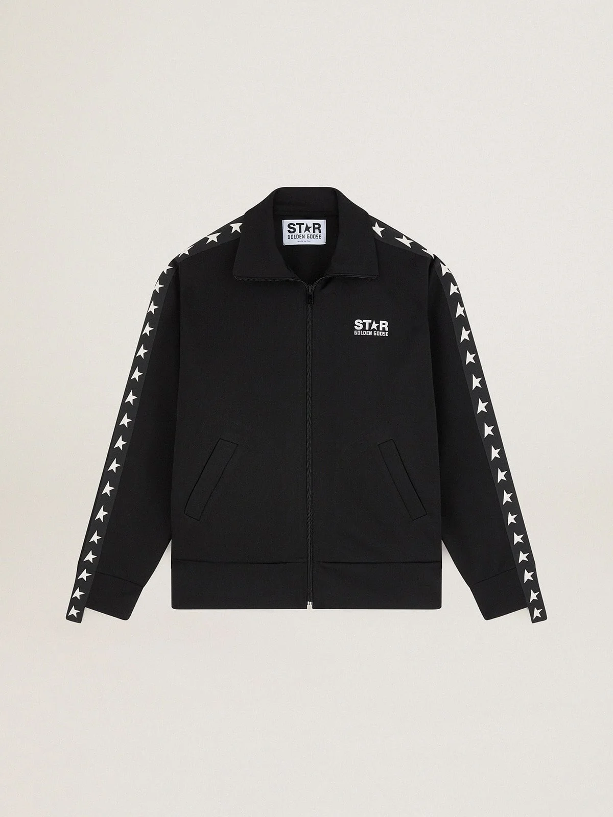 A collection with a casual soul but a versatile attitude: inspired by the Seventies, it has a timeless vintage appeal, suited to any occasion or look. With its zip and regular fit, this sweatshirt in black textured triacetate features a tone-on-tone grosgrain band on the sleeves with white stars. The contrasting logo on the front adds the finishing touch. A versatile garment for all your looks. DETAILS Item No. GWP00875.P000520.80203 - Color: black - Black grosgrain band on the sleeves with contrasting white stars - Contrasting white logo on the front - Zip fastening - Long sleeves - Main material: 100% polyester - Made in Italy The model is 177 cm tall and is wearing a size S.