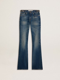 Women's bootcut jeans with a vintage wash and metallic details