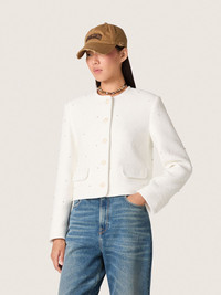 Our Holiday Collection is a celebration of woven textures and sharp tailoring, blending with soft knits, velvet whispers, archive florals, and satin that catches the light just right. Crafted from boucle cotton in vintage white, this boxy-fit women’s jacket features all-over bead embroidery. The button fastening, two front pockets and the iconic double star on the back complete the look. DETAILS Item No. GWP01506.P002319.10189 - Holiday Collection - Color: vintage white - Women's model - Boxy fit - All-over bead embroidery - Front fastening with buttons - Front pockets - Double star on the back - Main material: 60% cotton, 20% polyester, 10% viscose, 10% acrylic - Lining: 52% viscose, 48% acetate - Decoration: 70% glass, 30% polymer - Decoration: 100% polyester - Made in Italy The model is 177 cm tall and is wearing a size S.