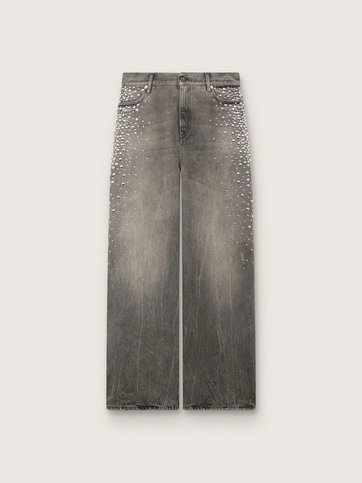 Our Holiday Collection is a celebration of woven textures and sharp tailoring, blending with soft knits, velvet whispers, archive florals, and satin that catches the light just right. Made of gray cotton denim with Iron Wash, these women's boyfriend jeans feature a gradient application of silver studs on the front and back, and a five-pocket design with belt loops. The double star on the back completes the look. DETAILS Item No. GWP02079.P002348.60100 - Journey Collection - Color: gray - Women's model - Boyfriend fit - Five-pocket style - Gray cotton denim with Iron Wash - Gradient-effect silver-colored studs - Belt loops - Fastening with a button and zip - Main material: 100% cotton - Pocket lining: 65% polyester, 35% cotton - Made in Italy The model is 177 cm tall and is wearing a size 26.