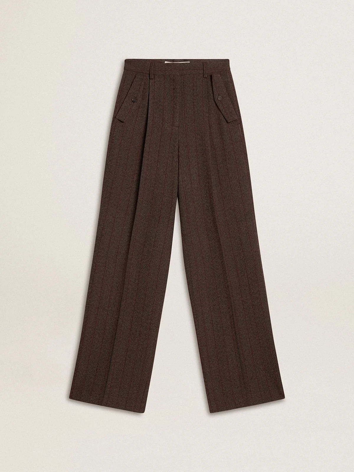 The second drop in the Fall/Winter 25 collection unfolds like a relaxed and refreshing journey, woven into the fabric of each and every piece. These women's brown wool pants feature a wide leg and thin vertical stripes. The double patch pocket on the front and the double star on the back add the finishing touch. DETAILS Item No. GWP02463.P002094.83120 - Journey Collection - Color: brown - Wide leg - Two front patch pockets - Vertical thin strips - Main material: 100% virgin wool - Made in Italy The model is 177 cm tall and is wearing a size 40.