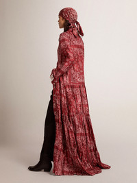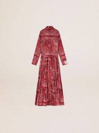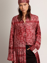 A unique, timeless collection that encapsulates the Golden Goose DNA, designed to remain with you every day, through thick and thin, come rain or shine. This burgundy shirt dress in fluid viscose features a paisley print and a tone-on-tone belt at the waist. The detachable white patch with a finely embroidered letter G in red adds the finishing touch. DETAILS Item No. GWP00824.P000633.81268 - Color: burgundy - Paisley print - Tone-on-tone belt at the waist - Double gold star at the back - Detachable white patch with embroidered red letter G - Long sleeves - Side slits - Mother-of-pearl button fastening - Main material: 100% viscose - Made in Italy The model is 177 cm tall and is wearing a size S.