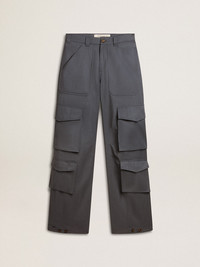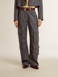 A love story to our home, Marghera. Where everything began. Our latest collection reflects the spirit of our birthplace, its contrasts, industrial soul, and manufacturing landscapes, weaving together inspirations from both the vibrant energy of workwear and the refined essence of traditional tailoring. In baby blue wool, these women's cargo pants feature ten pockets and a button fastening at the waist and on the bottom hem. The choice of material is no accident, as this lightweight wool is ideal to be worn with the arrival of the summer. DETAILS Item No. GWP02012.P001609.50864 - Journey Collection - Color: baby blue - Stitching on the garment - Double star on the back - Ten pockets - Wide leg - Main material: 100% virgin wool - Made in Italy The model is 177 cm tall and is wearing a size 40.