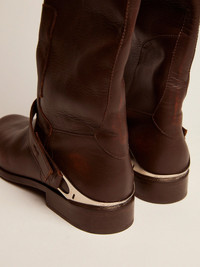 Horse-riding soul and vintage finish: our Charlie Boots encompass all the values that make us stand out, from a love of craftsmanship to maximum attention to detail. With this version, we have made a journey back to our origins to reinterpret one of our archive pieces. With a dark brown leather upper, these boots feature a clamp detail on the heel, to which is attached a tone-on-tone leather band on the instep. And the finely engraved Golden Goose signature on the back of the clamp adds the finishing touch. DETAILS Item No. GWF00236.F002300.55381 - Color: dark brown - Clamp on the heel with engraved Golden Goose signature - Tone-on-tone leather band on the instep - Vintage finish - Heel height: 2.5 cm - Leg height: 45 cm - Upper: 100% cowhide leather - Lining: 100% cow leather - Sole: 100% cow leather - Made in Italy