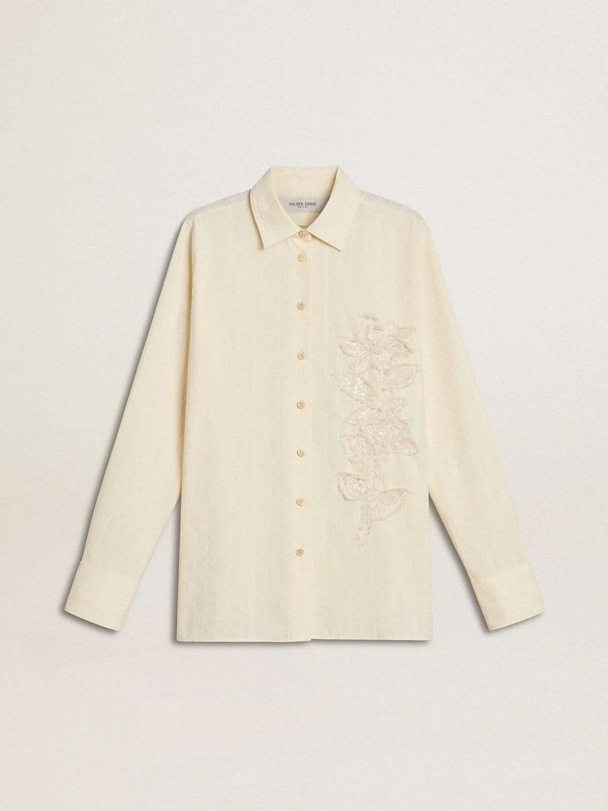 Inspired by the iconic Seventies, the carefree spirit of that era comes to life with the first drop of our Fall/Winter 25 collection. This women's cream-colored shirt features vertical raised stripes and floral embroidery decorated with white sequins. The button fastening and two little stars on the back add the finishing touch. DETAILS Item No. GWP02481.P002152.20102 - Journey Collection - Color: cream - Raised vertical stripes - Floral embroidery decorated with white sequins - Button fastening - Main material: 100% cotton - Made in Italy The model is 177 cm tall and is wearing a size S.