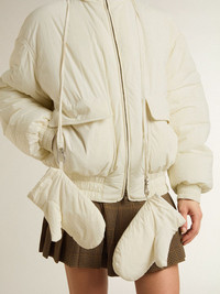 The third drop in our Fall/Winter 25 collection channels the funky glamor of the 1970s, a time when the night transformed into a canvas for unapologetic self-expression. In a cream-colored women’s version, this oversized fit padded jacket features a zip fastening and two front pockets to which the gloves can be attached. DETAILS Item No. GWP02342.P002096.20102 - Journey Collection - Color: cream - Oversized fit - Zip fastening - Two front pockets - Attached gloves - Lining material: 100% polyamide - Glove lining material: 100% cotton - Padding: 100% polyester - Made in Italy The model is 177 cm tall and is wearing a size S.