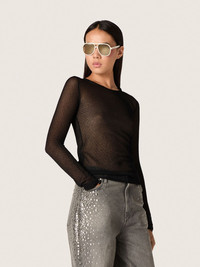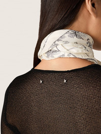 Our Holiday Collection is a celebration of woven textures and sharp tailoring, blending with soft knits, velvet whispers, archive florals, and satin that catches the light just right. Made of black viscose, this women's sweater features a floral motif in a jacquard knit and a slim silhouette with a crew neck and long sleeves. The iconic stars embroidered on the back complete the look. DETAILS Item No. GWP02238.P002394.90100 - Journey Collection - Color: black - Women's model - Slim fit - Jacquard floral motif - Crew-neck style with long sleeves - Double star on the back - Main material: 80% viscose, 20% polyamide - Hem: 80% viscose, 20% polyamide - Made in Italy The model is 177 cm tall and is wearing a size S.