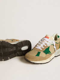 Urban style and a spirit of craftsmanship are combined in our Dad-Star sneakers: the ideal companion for your metropolitan adventures. This women’s model features a beige nylon upper accentuated with a green star and white leather heel tab. The brown suede insert and white laces add the finishing touch. DETAILS Item No. GWF00199.F006460.11207 - Beige nylon upper - Green leather star - White leather heel tab - Brown suede inserts - Beige mesh tongue - White laces - Vintage finish - Upper: 59% cow leather, 31% polyester, 6% polyurethane, 4% polyamide - Lining: 71% cow leather, 15% polyester, 8% polyurethane, 6% cotton - Sole: 100% rubber - Handmade - Made in Italy
