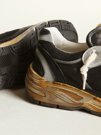 A soul with a wealth of stories to tell: our Dad-Star sneakers have timeless style, created to be passed down through the generations. With an abundance of sophisticated details, such as the yellowed sole expressing the idea of hanging your shoes in the sunlight, this women's version features a black mesh and nappa leather upper accentuated with an ice-gray suede star and a black nappa leather heel tab with reflective fabric inserts. The silver eyelets and cream-colored laces add the finishing touch. DETAILS Item No. GWF00199.F003270.90282 - Black mesh and nappa leather upper - Ice-gray suede star - Black nappa leather heel tab with reflective fabric inserts - Silver eyelets - Yellowed sole - Cream-colored laces - Vintage finish - Upper: 55% sheepskin leather, 27% polyester, 6% polyvinyl chloride, 5% glass fiber, 3% polyamide, 2% textile polyurethane, 2% cow leather - Lining: 62% cow leather, 33% cotton, 5% textile polyurethane - Sole: 100% rubber - Handmade - Made in Italy