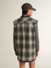 The third drop in our Fall/Winter 25 collection channels the funky glamor of the 1970s, a time when the night transformed into a canvas for unapologetic self-expression. This sleeveless shirt dress in dark grey wool blend features two front patch pockets and a fastening with black buttons. The light gray checkered pattern and black embroidery on the trim add the finishing touch. DETAILS Item No. GWP02356.P002157.60618 - Journey Collection - Color: dark gray - Sleeveless - Two patch pockets - Light gray checkered pattern - Fastening with black buttons - Black embroidery on the trims - Main material: 53% virgin wool, 29% polyamide, 18% silk - Made in Italy The model is 177 cm tall and is wearing a size S.